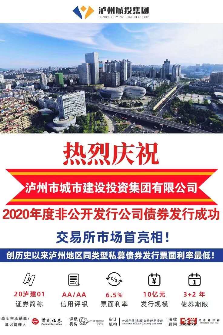 9月25日,瀘州城投集團2020年度首期非公開發(fā)行公司債成功發(fā)行,發(fā)行金額10億元,期限3+2年,票面利率6.50%,創(chuàng)歷史以來瀘州地區(qū)同類型私募債券票面利率最低。本期債券牽頭主承銷商為首創(chuàng)證券,現(xiàn)已認購完畢,當日資金已到達瀘州城投集團公司賬戶。這是瀘州城投集團在債券市場首次亮相,未采取擔保、抵押、增信等手段,是提高資本市場認可度的一次成功檢驗。