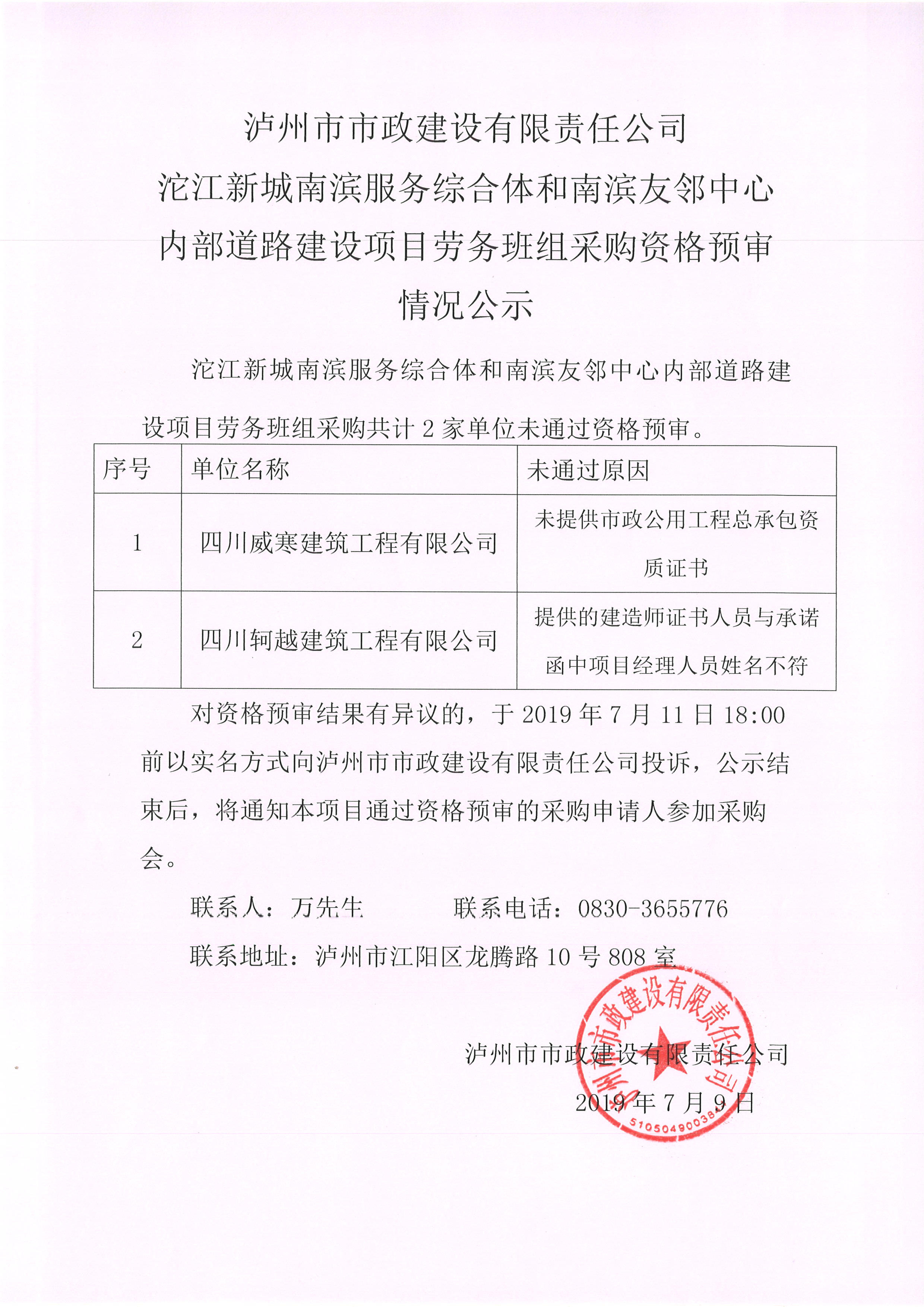 沱江新城南濱服務綜合體和南濱友鄰中心內部道路建設項目勞務班組采購資格預審情況公示