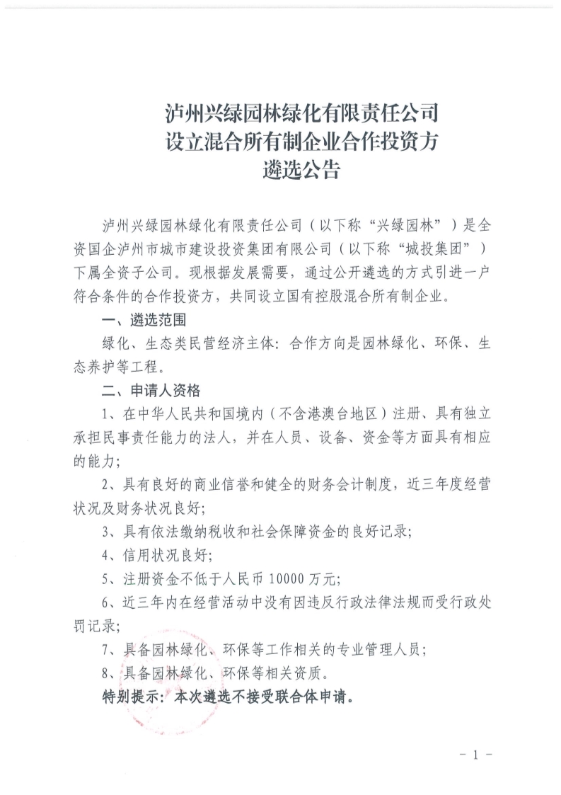 興綠園林公司設(shè)立混合所有制企業(yè)合作投資方遴選公告