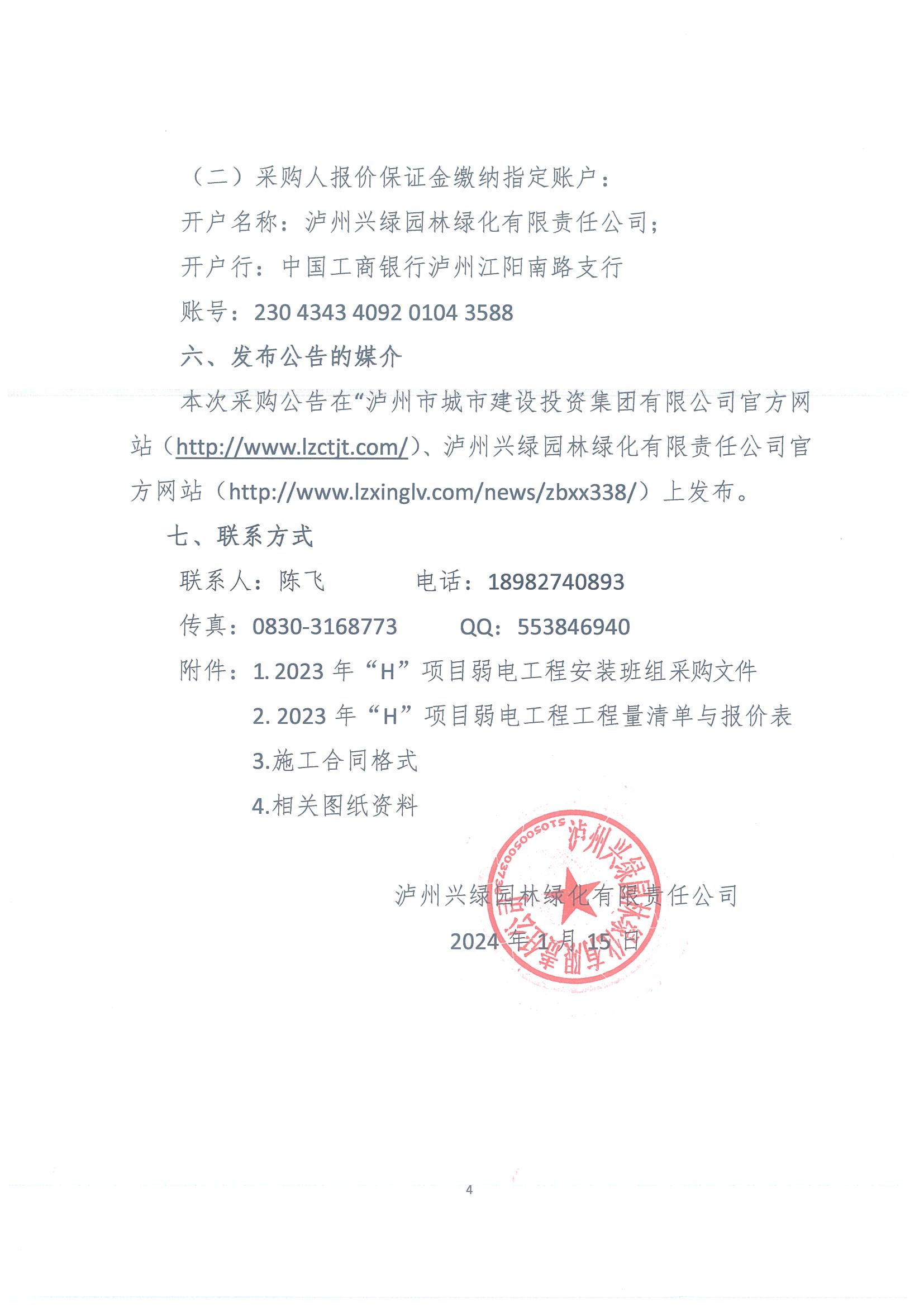 瀘州興綠園林綠化有限責(zé)任公司關(guān)于 2023年“H”項(xiàng)目弱電工程安裝班組采購公告