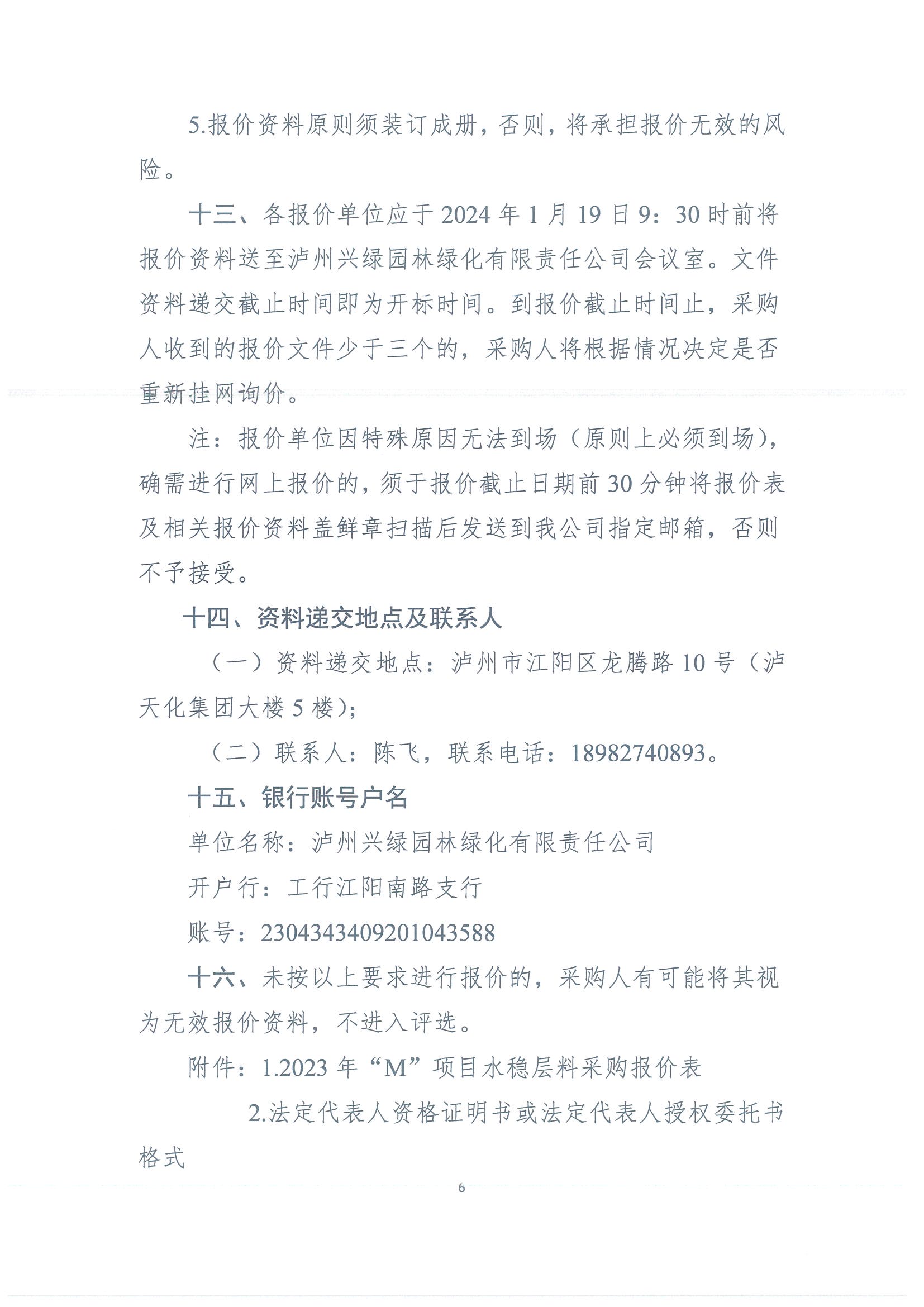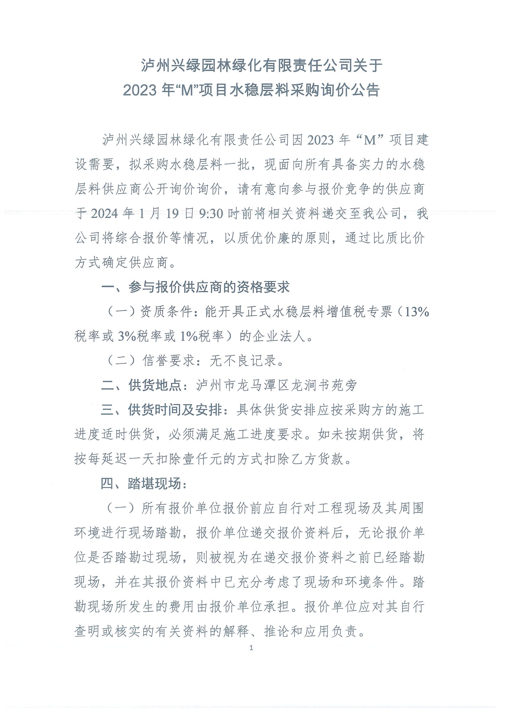 瀘州興綠園林綠化有限責任公司關于 2023年“M”項目水穩(wěn)層料采購詢價公告