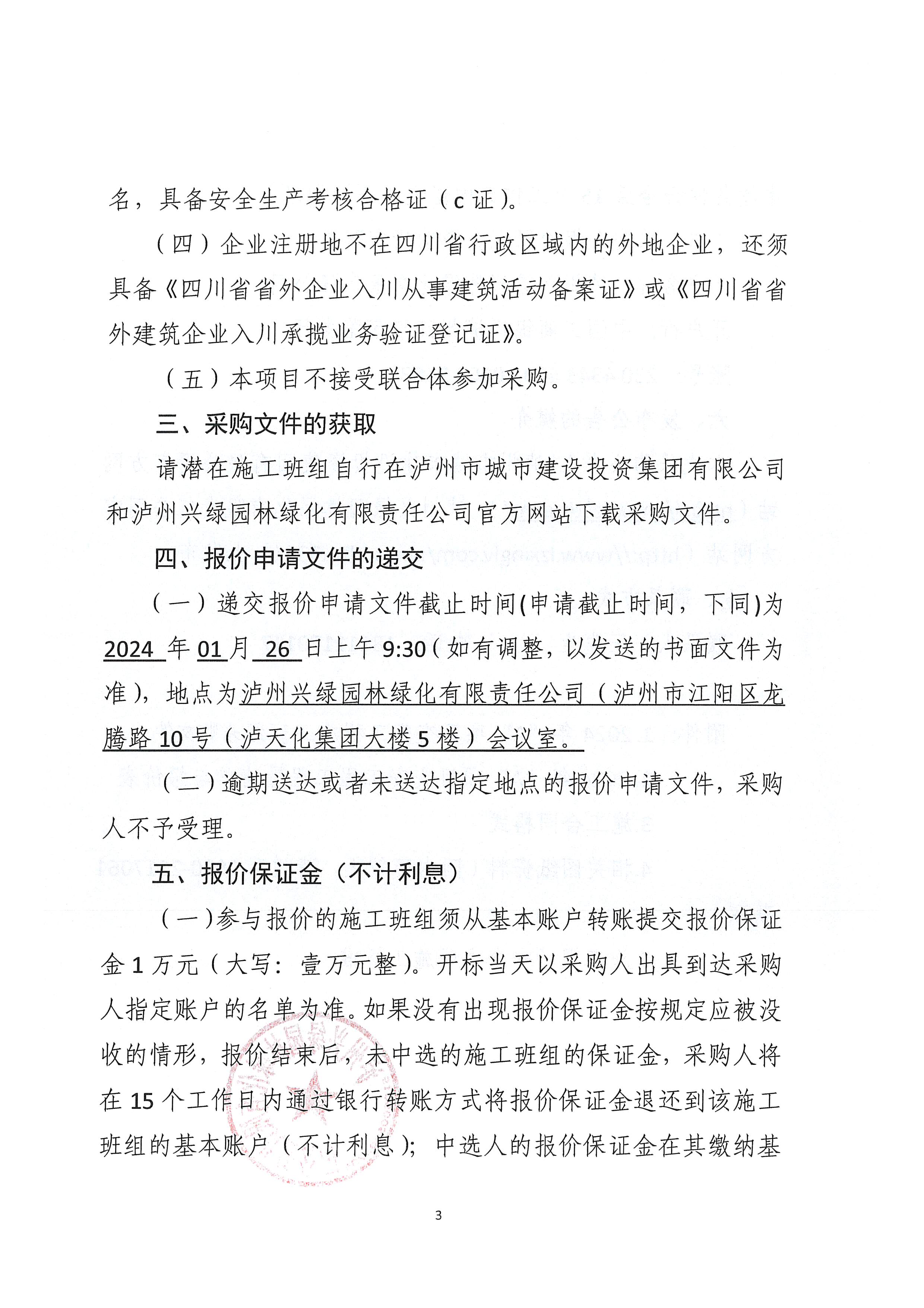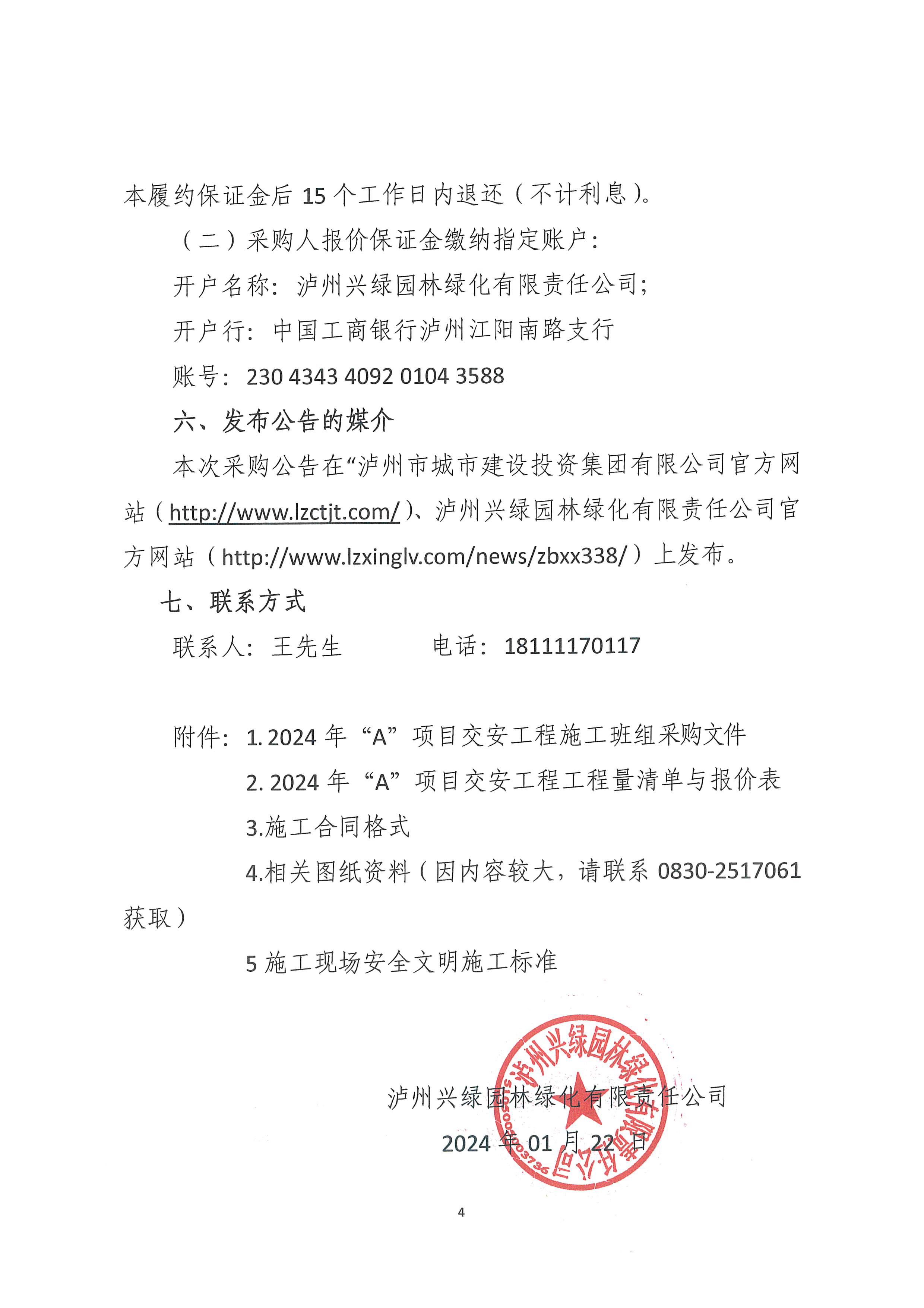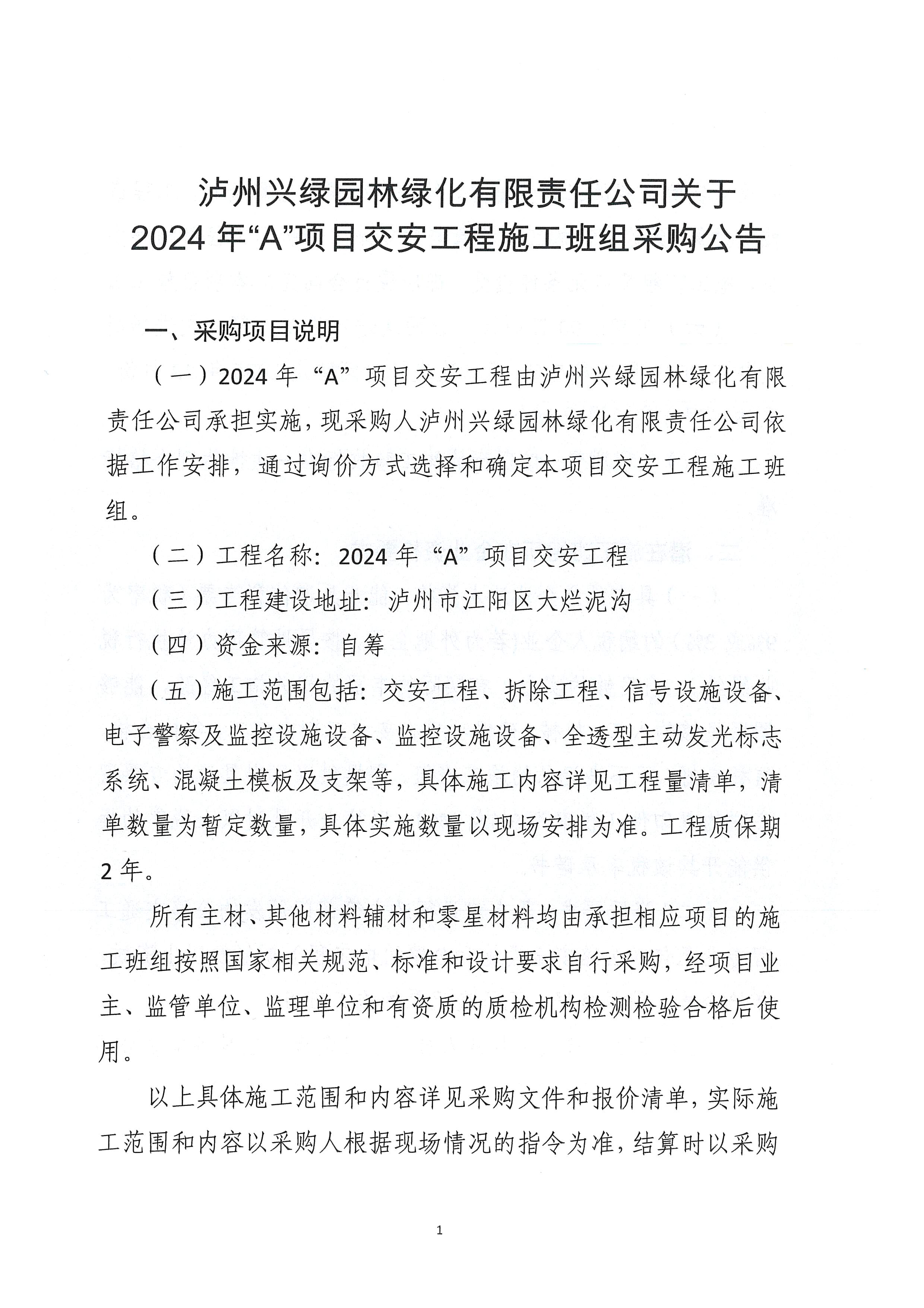 瀘州興綠園林綠化有限責任公司關(guān)于 2024年“A”項目交安工程施工班組采購公告