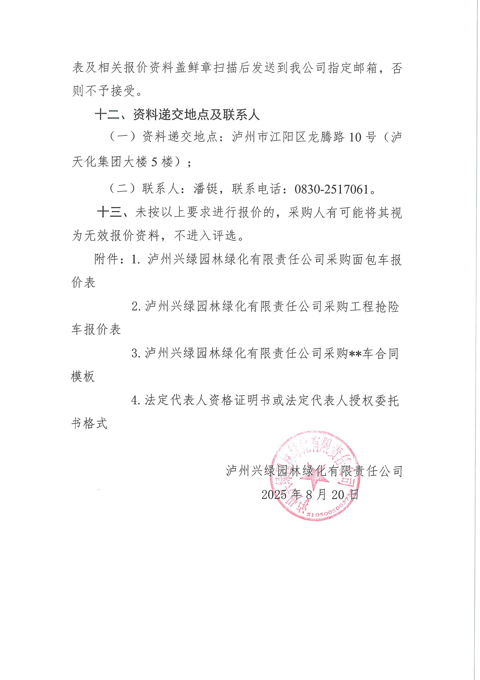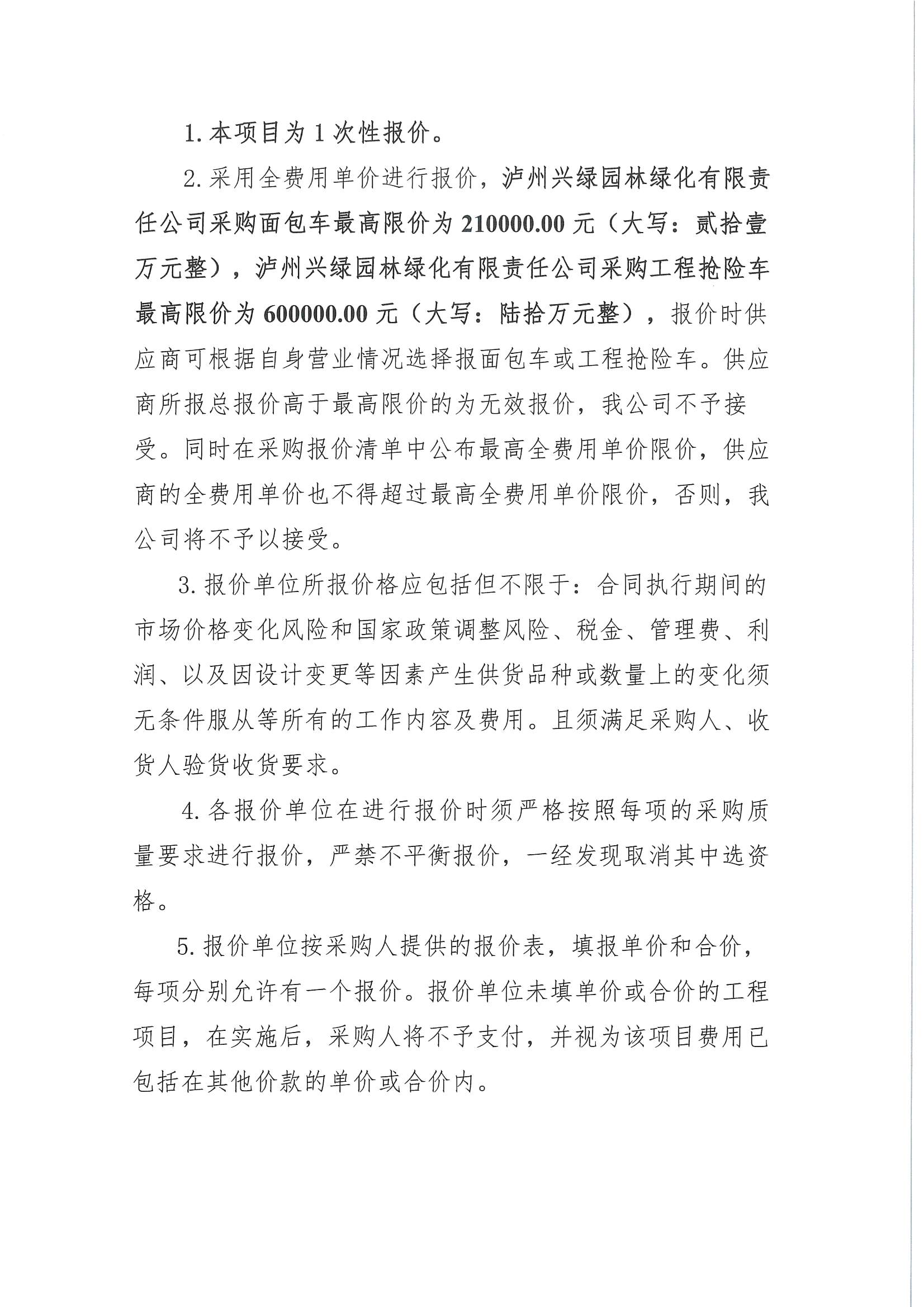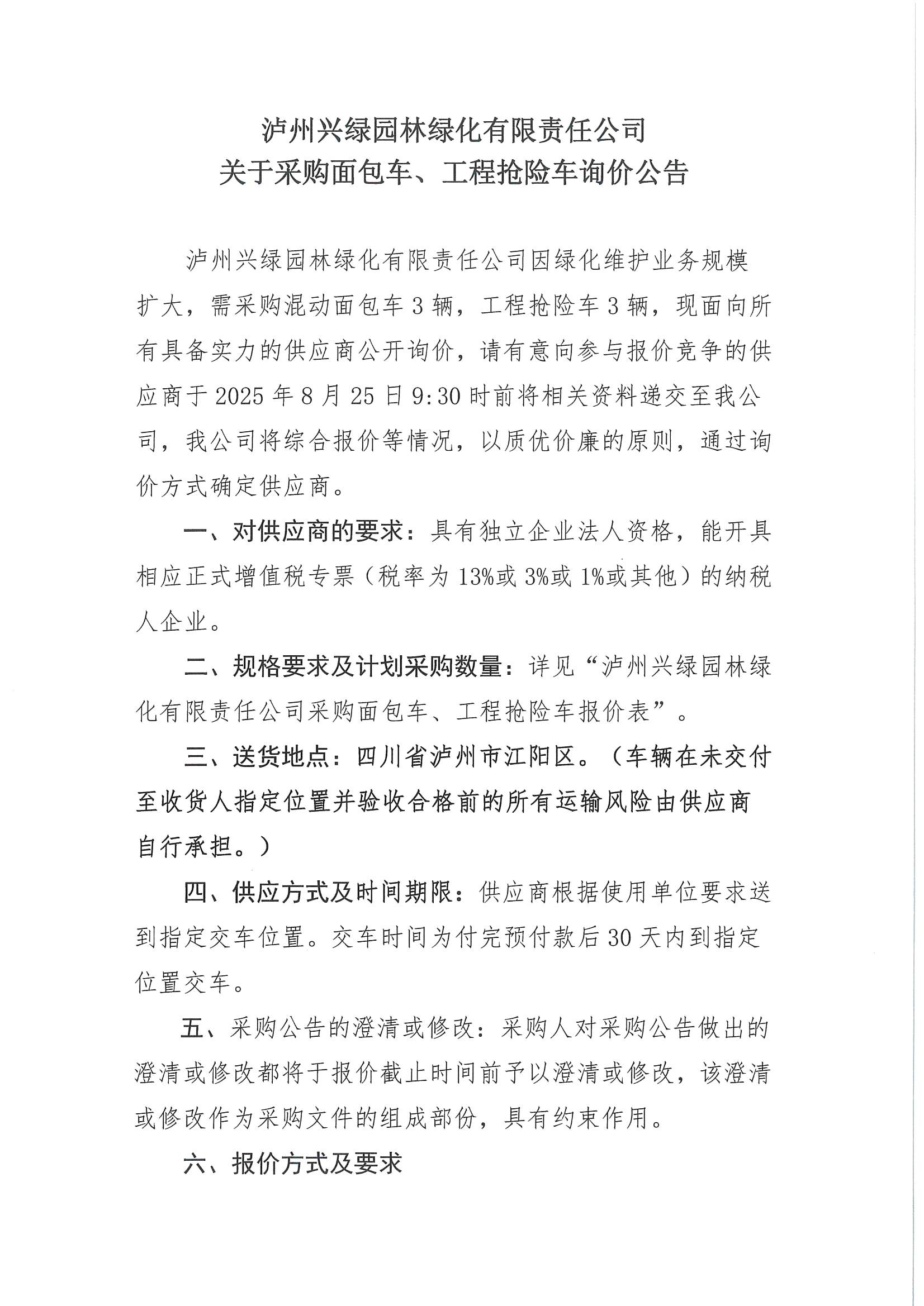 瀘州興綠園林綠化有限責(zé)任公司關(guān)于采購(gòu)面包車、工程搶險(xiǎn)車詢價(jià)公告