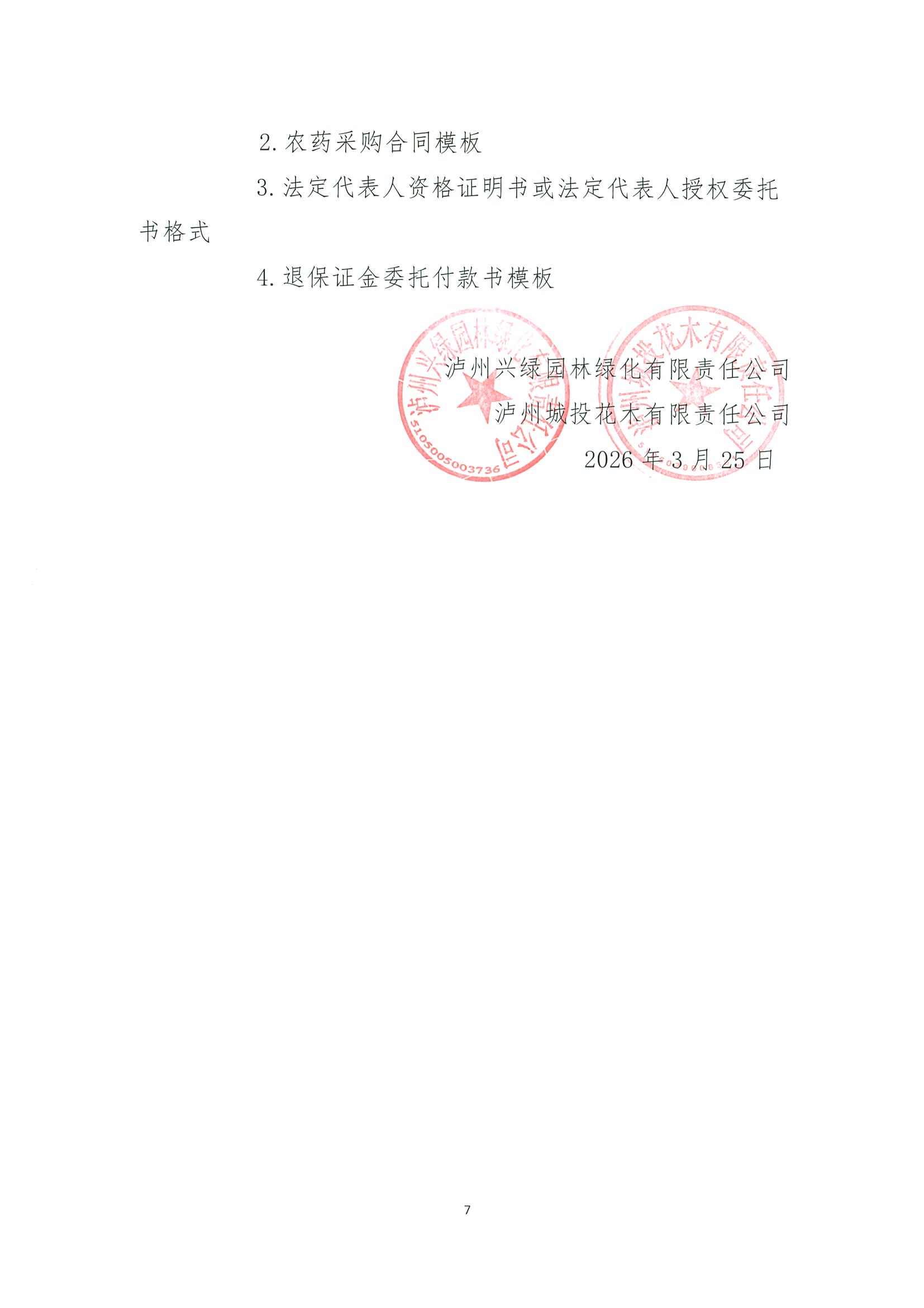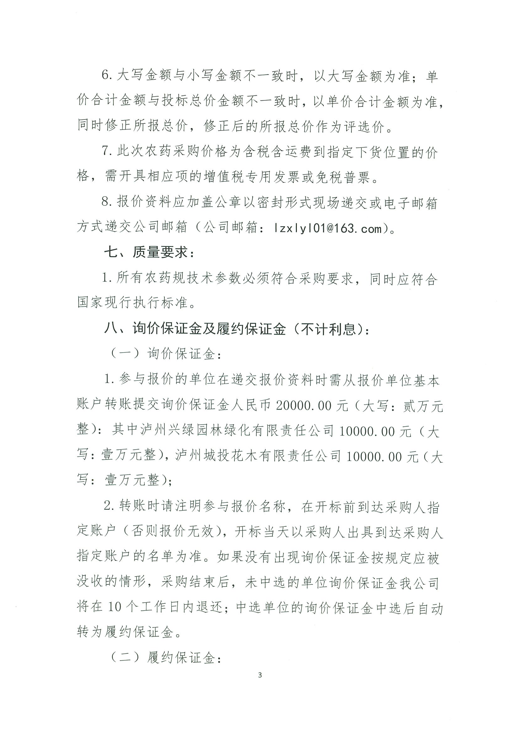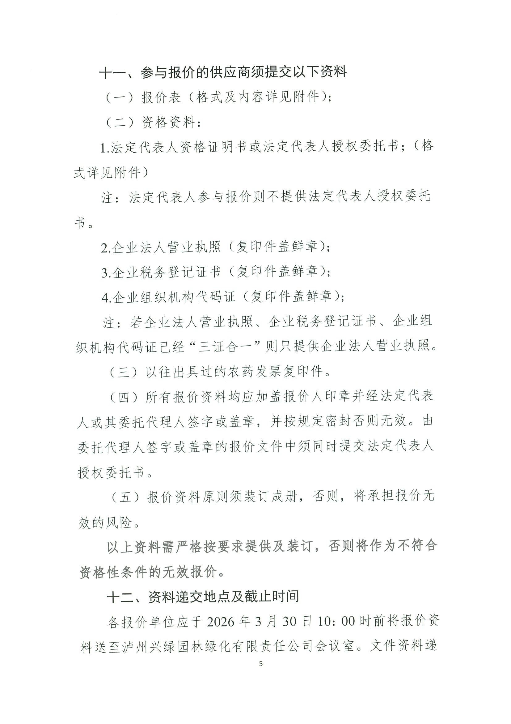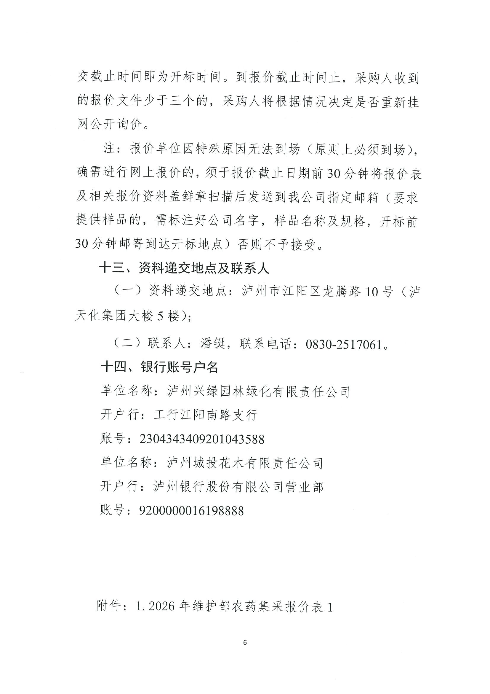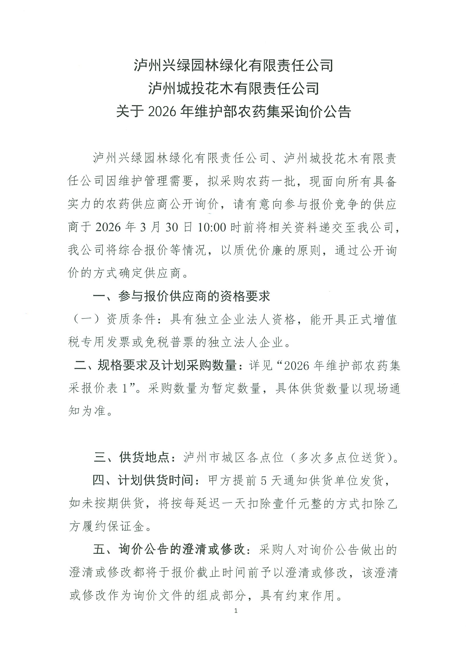 瀘州興綠園林綠化有限責任公司、瀘州城投花木有限責任公司關(guān)于2026年維護部農(nóng)藥集采詢價公告