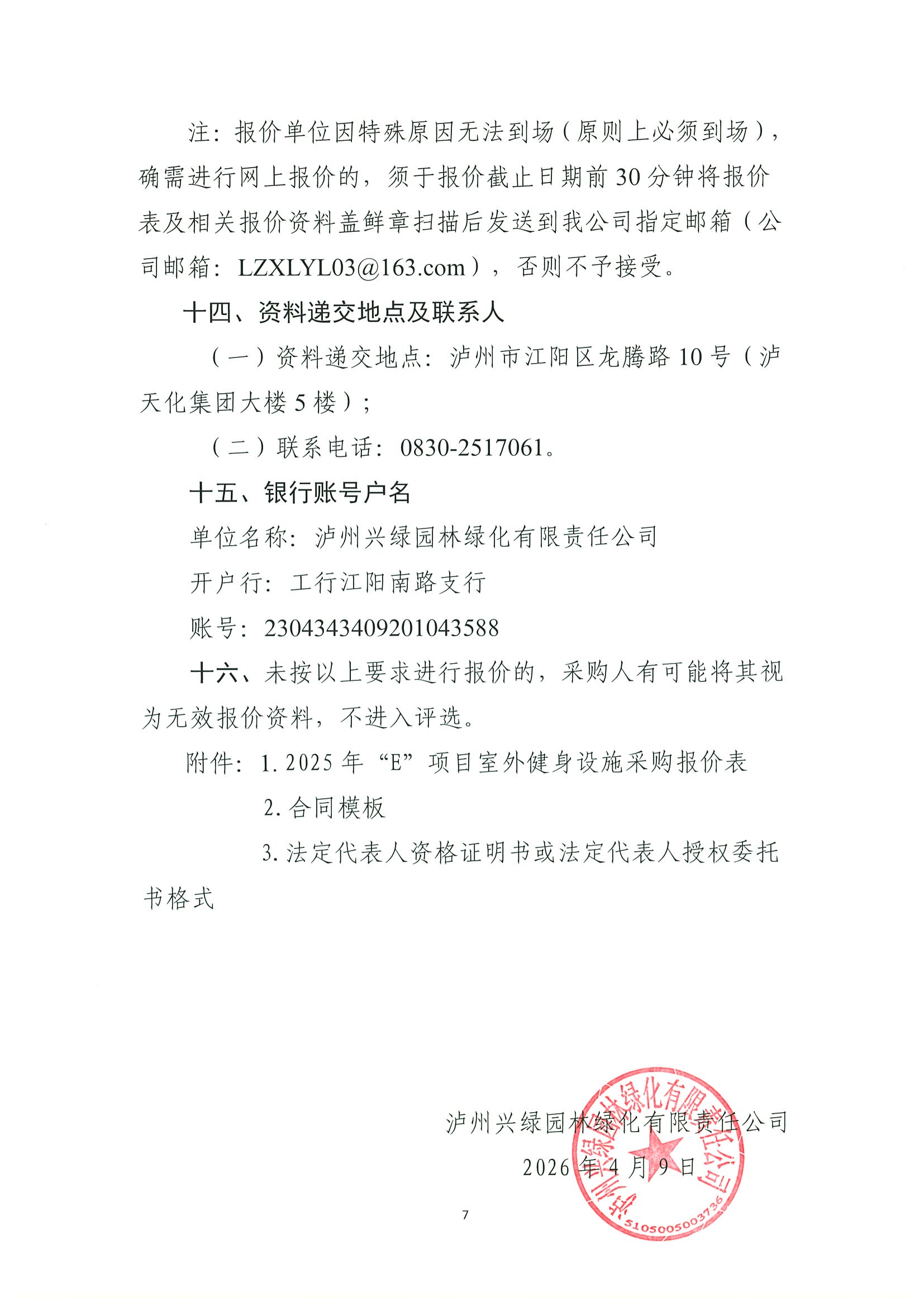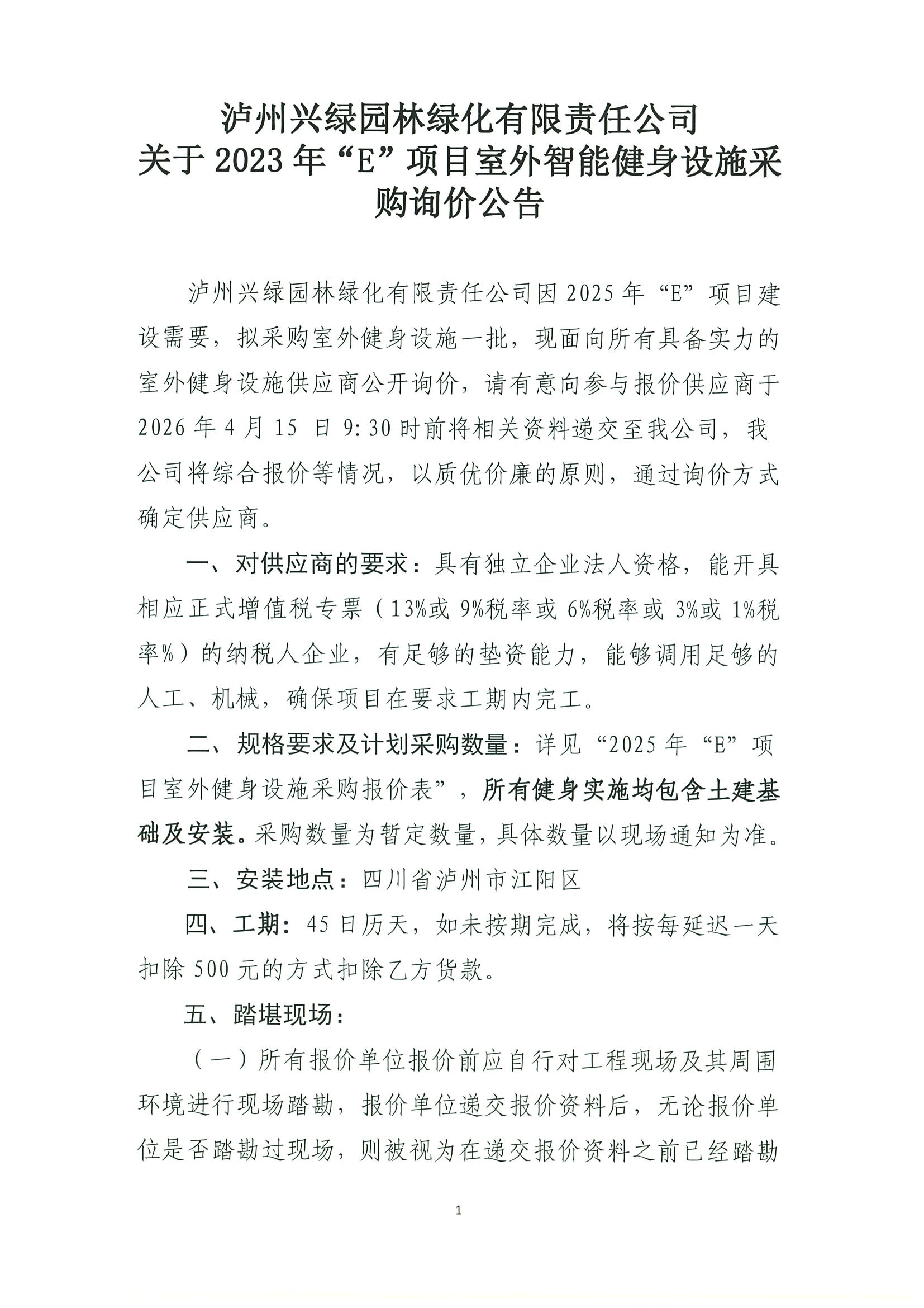 瀘州興綠園林綠化有限責(zé)任公司 關(guān)于2023年“E”項目室外智能健身設(shè)施采購詢價公告